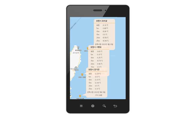 - 전용 핸드폰 Application을 통해 이용자들은 실시간으로 지역별 수심별 수온 데이터를 확인 가능